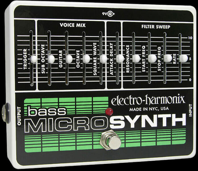 A Bass Micro Synthesizer egy teljesen analóg, basszusgitárra optimalizált eszköz, mellyel perkusszív, vonós jellegű, visszafelé szóló és sok más "szintetikus" hangzást hozhatunk létre. 4 állítható és keverhető hang szekció (sub, originál, felső oktáv, szögletes hullámforma), állítható pontú szűrők a Filter Sweep szekcióban (Start, Stop, Resonance freq. , Attack, Rate stb. ) True Bypass