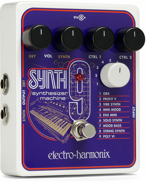 1. The SYNTH9 is generally best used as the first pedal in an effects chain. Place modulation, delay, and reverb effects after the SYNTH9. The unit will not perform well if placed in the effects loop of a guitar amp. 2. For optimal playability, set the guitar’s pickup selector to the bridge pickup and turn the volume knob all the way up (10). 3. Avoid placing a distortion or overdrive in front of the SYNTH9, which could muddy up the input signal and cause the tracking to be unstable. If you want to add overdrive or distortion, place it after the SYNTH9. 4. The SYNTH9 has a built in compressor that is active on the synth sounds at all times. We recommend you do not insert another compressor into your signal chain while the SYNTH9 is in effect mode. Quick Specs- Transforms the tone of your guitar or bass into that of a vintage synthesizer- 9 presets that were created to emulate many of the most popular synthesizer sounds ever- Works on guitar or bass without modifications, special pickups or MIDI implementation- The SYNTH9’s usable tracking range extends up to about the 23rd fret on the high-E string of a standard guitar and down to the open A-string on a bass guitar- Use the SYNTH9 with a B9 or C9 Organ Machine as well as the KEY9 Electric Piano Machine and MEL9 Tape Replay Machine to create your own mega-keyboard setup- EHX 9.6DC-200 PSU included- Dimensions in inches: 4.0 (w) x 4.75 (l) x 2.25 (h)- Dimensions in mm: 102 (w) x 121 (l) x 89 (h)
