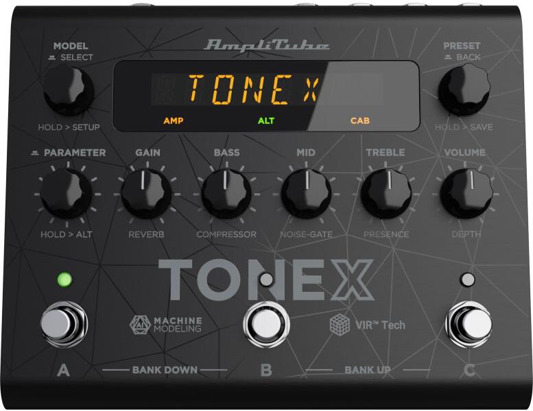 Irányítás: 3x FS, Model/Select, Preset/Back, Parameter, Gain/Reverb, Bass/Compressor, Mid/Noise-Gate, Treble/Presence, Volume/Depth,